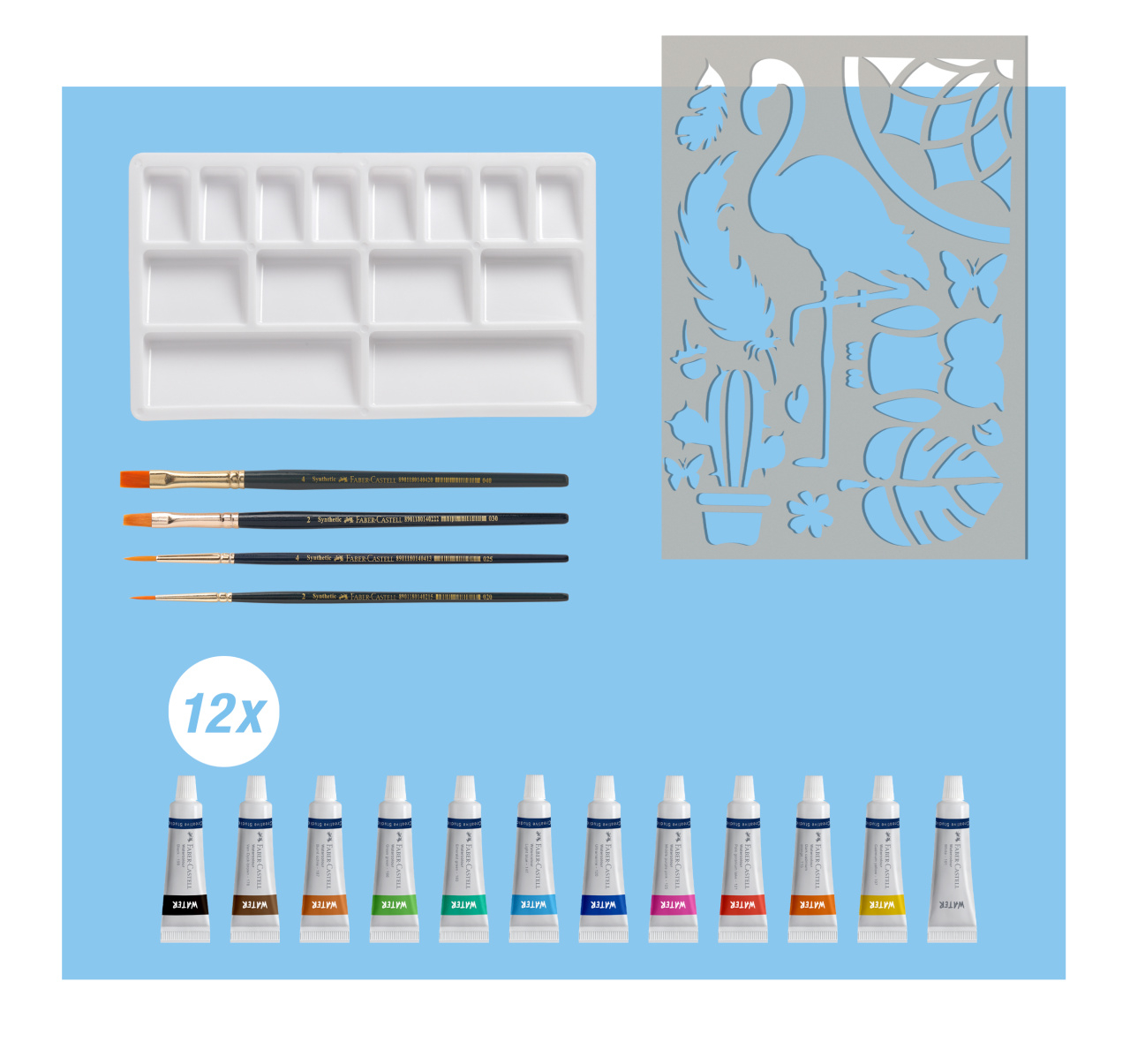 Culori intense si stralucitoare. Pot fi dizolvate din nou odata aplicate. Mixabilitate perfecta a nuantelor luminoase si inchise. Usor de diluat. Setul include 4 pensule , 1 paleta de amestecare ( plastic robust, usor de spalat) si un sablon din plastic. Ambalaj din carton cu 12 culori in tuburi de 5 ml. Culorile produselor pot diferi in realitate fata de cele din imaginile prezentate.