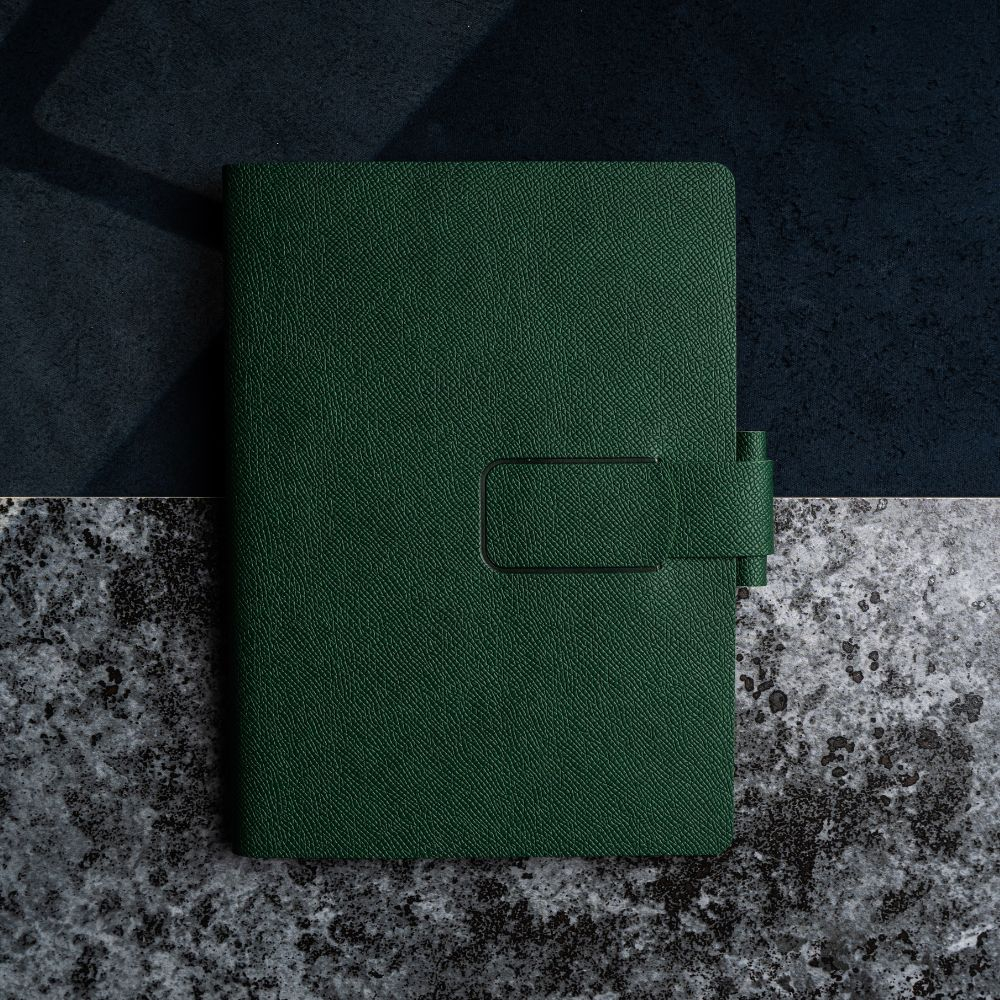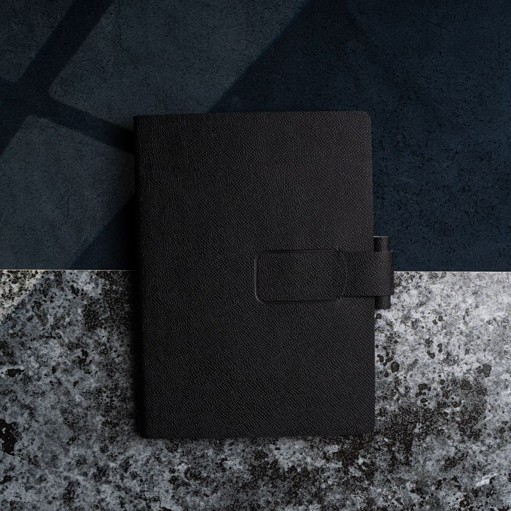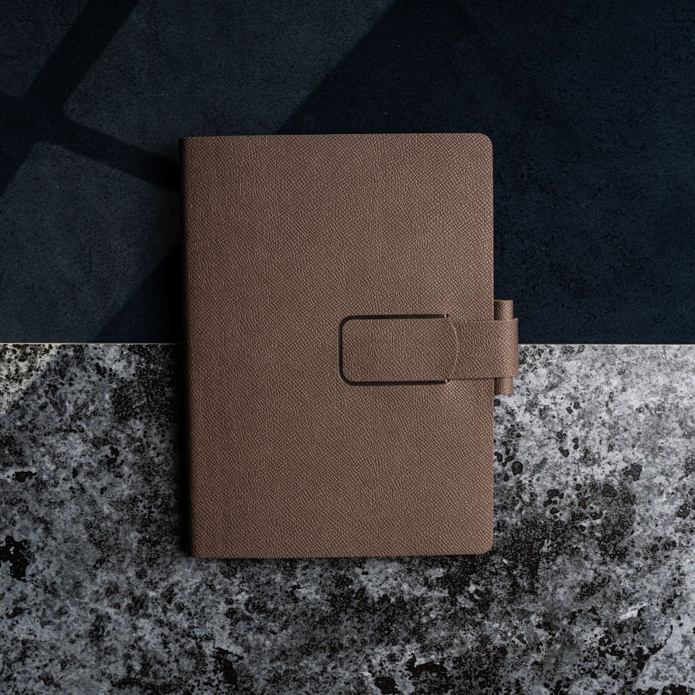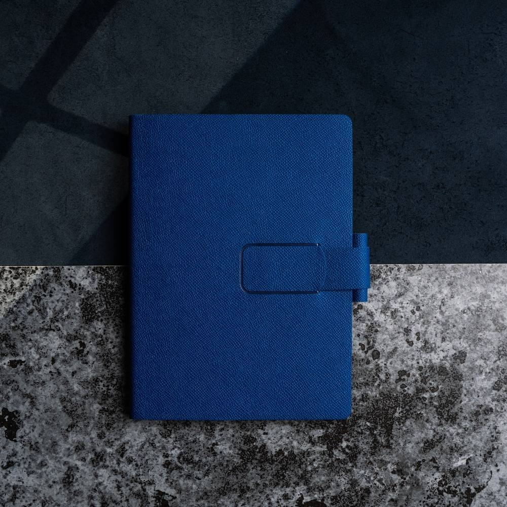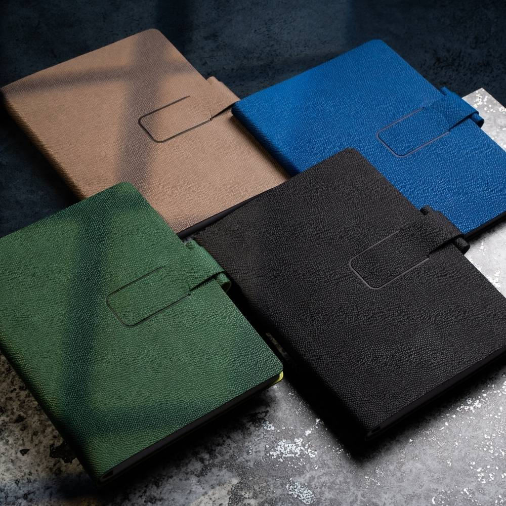 Coperta flexibila, din piele PU dubla fata, cu suport pentru pix, colt rotund, inchidere cu clapa reglabila.