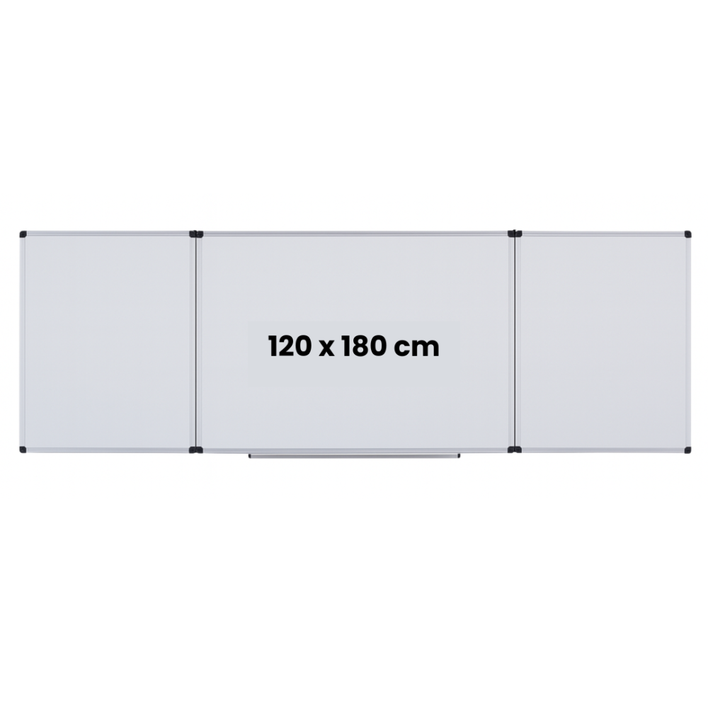 # Tabla alba magnetica triptica Optima, cu dimensiunile de 120x180 cm pentru panoul central si doua panouri laterale de 90x120 cm fiecare, ofera o solutie versatila si eficienta pentru prezentari si activitati educationale. # Suprafata magnetica alba: Permite utilizarea markerelor lavabile si fixarea documentelor cu magneti, facilitand interactiunea si organizarea informatiilor. # Cinci suprafete de scris: Cele doua panouri laterale se pot inchide peste panoul central, oferind protectie si posibilitatea de a ascunde informatii pana la momentul dorit. # Rama din aluminiu: Asigura durabilitate si un aspect profesional, integrandu-se armonios in diverse medii, de la sali de clasa la birouri. # Tavita pentru accesorii: Include o tavita practica pentru depozitarea markerelor si a buretelui, mentinand ordinea si accesibilitatea instrumentelor de scris. # Montare pe perete: Sistemul de prindere este conceput pentru o instalare usoara si sigura, cu accesorii incluse pentru fixare.