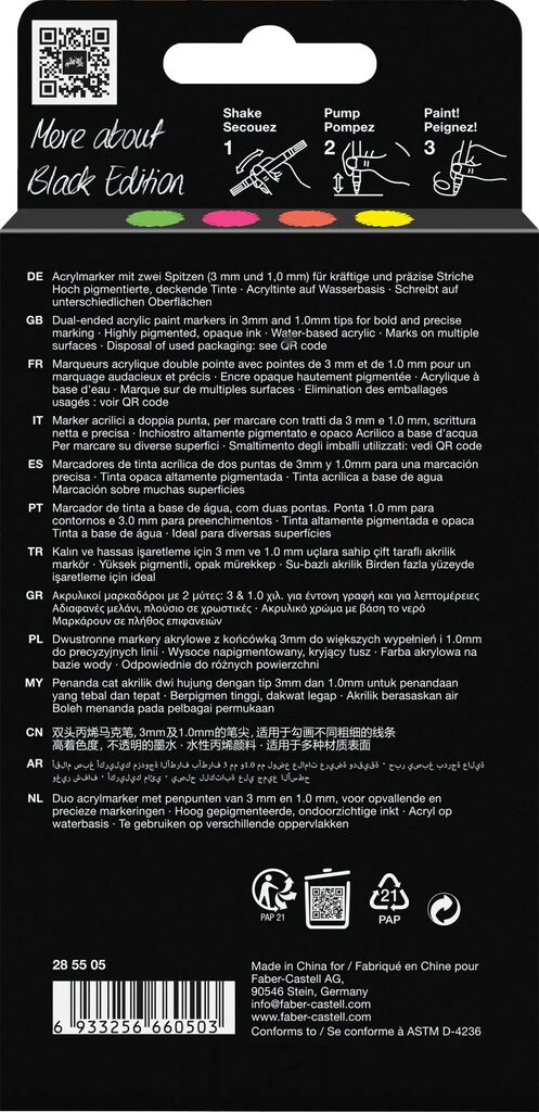 Set ce contine 4 markere acrilice in culori neon (galben, roz, verde si portocaliu) Shake&Paint de la Faber-Castell. Cu un design modern si functionalitate excelenta, aceste markere ofera culori neon puternice, usor de aplicat pe o varietate de suprafete (hartie, carton, lemn, panza, sticla, metal, piatra si plastic). Cerneala pe baza de acril, cu acoperire intensa si opaca. Culori luminoase, vibrante, vizibile chiar si pe suprafete inchise la culoare. Cerneala trebuie agitata bine inainte de utilizare pentru a asigura o distributie uniforma a pigmentului. Varful mediu de aproximativ 1.5 mm este ideal pentru scris, desen, contur si colorare. Markerele sunt rezistente la apa si lumina dupa uscare ceea ce le face perfecte pentru proiecte de lunga durata. Recomandari de utilizare: a se agita bine markerul inainte de fiecare utilizare, apoi se apasa usor varful pe o suprafata pentru a incepe fluxul de cerneala. Depozitarea markerelor in pozitie orizontala duce la o durata de viata mai mare.
