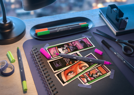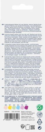 Set de 6 markere cu cerneala pe baza de alcool. Varfuri de tip pensula moale, flexibila, pentru lucrari artistice si fineliner pentru contururi si detalii. Uscare rapida, cerneala permanenta. Opacitate inalta, datorita aplicariirepetate a culorii. Culori usor de imbinat. Grosime linie 0.6 mm. Capac si corp fabricate din material 100% reciclat (pot exista mici variatii de culoare in productie).