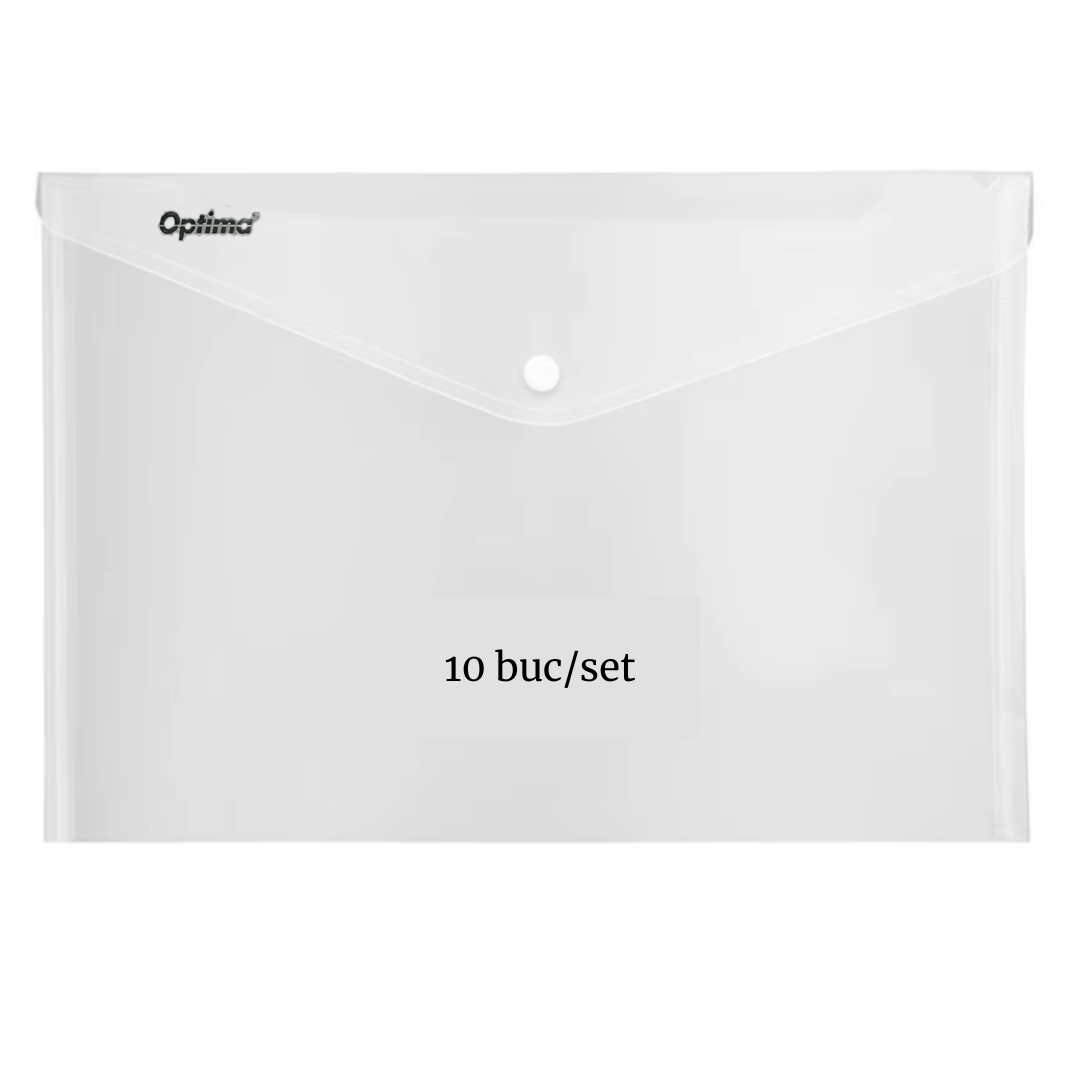 # Organizeaza-ti si protejeaza-ti documentele cu stil si eficienta folosind mapa de protectie documente Optima! # Conceputa pentru formatul A4, aceasta mapa este ideala pentru pastrarea in siguranta a proiectelor, planselor, desenelor sau oricaror documente importante de mari dimensiuni. # Material de calitate premium: Realizata din polipropilena (PP) rezistenta, mapa asigura o protectie durabila impotriva deteriorarii, umiditatii si prafului. # Inchidere sigura: Sistemul de inchidere cu capsa mentine documentele in siguranta, prevenind pierderea sau imprastierea acestora. # Set practic: Pachetul contine 10 mape, ideale pentru organizarea eficienta a mai multor proiecte. # Format: A4. # Culoare: transparent. # Material: polipropilena. # Grosime: 180 microni.