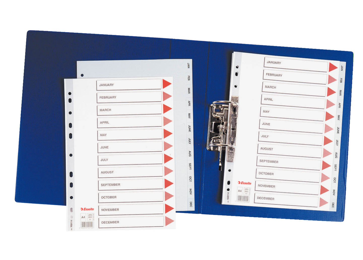 Index din polipropilena (PP) gri de 120 de microni, de foarte buna calitate, durabil, destinat organizarii si cautarii mai eficiente. Pagina de sumar pentru descrierea continutului. Prevazut cu 11 perforatii pentru arhivare in bibliorafturi sau caiete mecanice. Format: A4. Dimensiuni: 225 x 297 mm. Tip index: Ian-Dec.