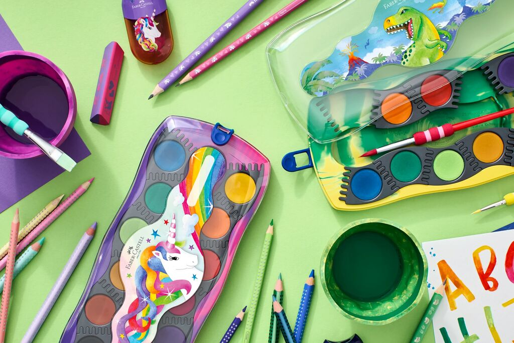 Acuarele 12 culori Connector Dinozauri Faber-Castell. Culori luminoase, solubilitate rapida, eficienta inalta. Capac transparent care permite inscriptionarea numelui copilului si utilizarea ca paleta pentru amestec nuante. Contine stickere cu dinozauri si un tub de alb. Culorile produselor pot diferi in realitate fata de cele din imaginile prezentate.