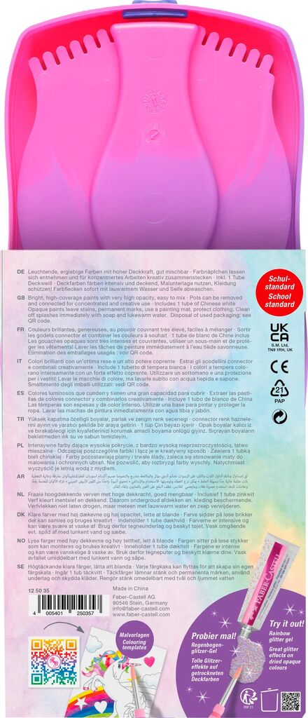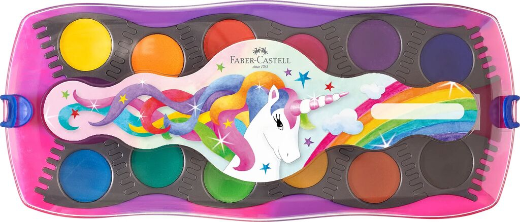 Acuarele 12 culori Connector Unicorni 2025 Faber-Castell. Culori luminoase, solubilitate rapida, eficienta inalta. Capac transparent care permite inscriptionarea numelui copilului si utilizarea ca paleta pentru amestec nuante. Contine stickere cu unicorni si un tub de alb. Culorile produselor pot diferi in realitate fata de cele din imaginile prezentate.