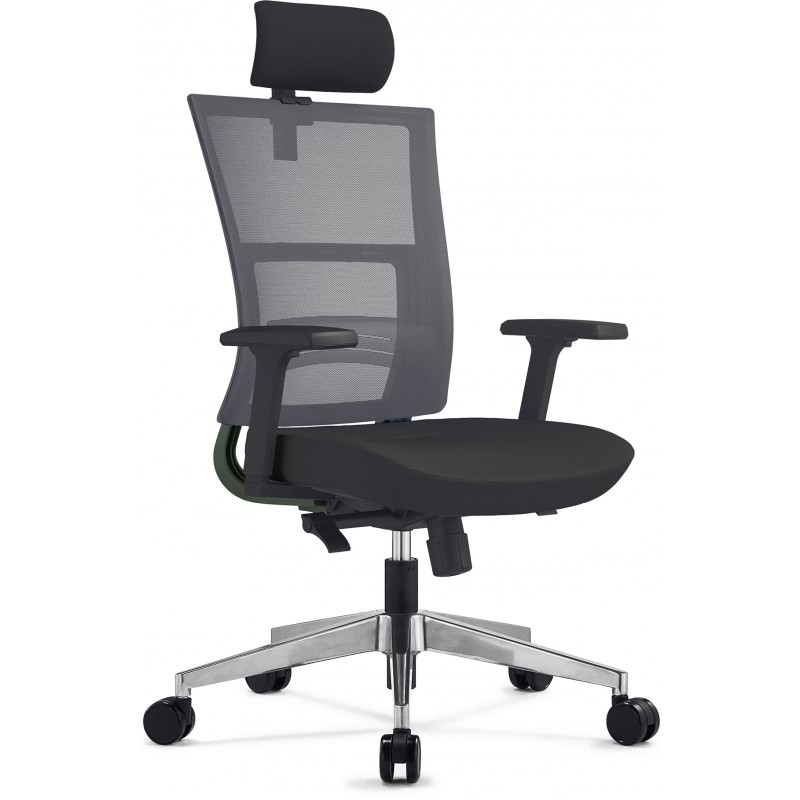 Spătar: mesh elastic gri. Elemente de susținere ale spătarului finisate gri închis ("gunmetal").